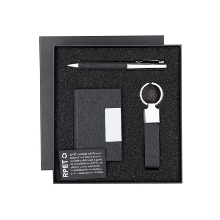 Set Fraxen: potencia tu marca con un artículo promocional pensado para destacar. Set Fraxen. Elegante set en RPET con acabado negro bitono y detalles metálicos. Incluye:-Tarjetero de RPET con exterior negro bitono combinado y detalle metálico, 1 compartimento interior y sistema de cierre magnético.-Bolígrafo de RPET de acabado negro bitono y detalles metálicos. Con mecanismo giratorio y tinta azul.-Llavero en RPET de acabado color negro bitono y accesorios cromados.Presentado en estuche individual negro. Incluye tarjeta negra interior con distintivo RPET.El material RPET se elabora a partir de plástico reciclado, para así fomentar la reutilización de residuos plásticos y ayudar a la sostenibilidad del planeta Beneficios clave: resistente y listo para el uso diario; superficie perfecta para grabar o imprimir tu logo. Fabricado en plástico reciclado. Personalízalo con tu logotipo para eventos, merchandising corporativo o campañas de fidelización.