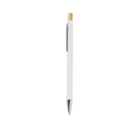 Bolígrafo Kosif: potencia tu marca con un artículo promocional diseñado para destacar. Bolígrafo Kosif. Bolígrafo de mecanismo pulsador fabricado en aluminio reciclado. Pulsador en bambú y cuerpo acabado goma mate. Clip metálico y distintivo aluminio reciclado en la parte superior del bolígrafo, en tinta azul.El aluminio reciclado es un material con posibilidades de reciclaje…