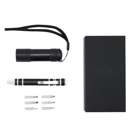 Set Lipan: potencia tu marca con un artículo promocional pensado para destacar. Set Lipan. Set de Herramientas Multifuncional con Linterna y Destornillador en aluminio. Incluye:- Destornillador con 6 cabezales imantados: 3 planos y 3 de estrella, equipado con un práctico clip metálico que facilita su enganche y transporte.- Linterna LED con 9 LEDs, alimentada por 3 pilas AAA (no incluidas). Incorpora cordón para muñeca, ofreciendo comodidad y seguridad en su manejo.Presentado en caja negra Beneficios clave: visibilidad diaria de tu marca en superficies metálicas; formato ligero y económico para campañas masivas. Medidas/Capacidad: 9 l. Personalízalo con tu logotipo para eventos, merchandising corporativo o campañas de fidelización.