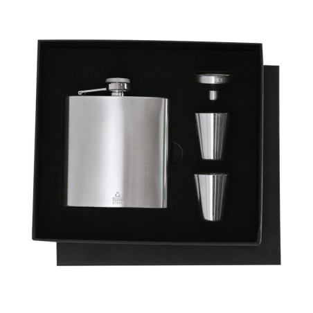 Set Petaca Almaz: potencia tu marca con un artículo promocional pensado para destacar. Set Petaca Almaz. Set de Petaca con Accesorios en Acero Inoxidable Reciclado. Incluye:- Petaca de 175 ml con sistema antigoteo y cierre de rosca para un almacenamiento seguro y sin derrames.- Dos vasos medidores de 30 ml de capacidad.- Embudo de dosificación, que facilita el llenado.Incluye distintivo de Acero Inox Reciclado. Prresentado en caja negra.El acero es uno de los materiales más demandados y que puede encontrarse casi en todas partes, desde productos de uso diario a grandes construcciones. Con innumerables propiedades, entre las que cabe destacar la durabilidad y su alto grado de reutilización, convirtiéndolo en una alternativa muy valorada en soluciones de sostenibilidad. Debidamente tratado, permite obtener nuevos recursos de infinita utilización Fabricado en acero inoxidable. Medidas/Capacidad: 175 ml, 30 ml. Personalízalo con tu logotipo para eventos, merchandising corporativo o campañas de fidelización.